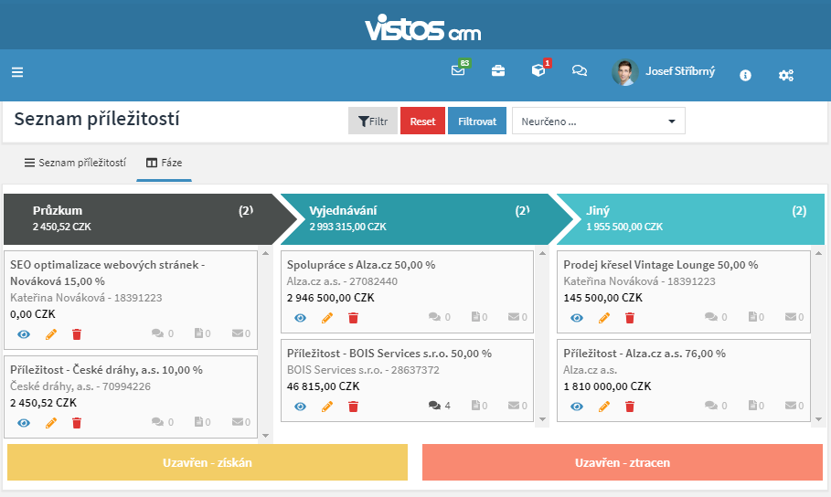 Vistos CRM používají společnosti s pestrým oborovým zaměřením. Chceme jim jejich práci co nejvíce usnadnit, a proto přicházíme s interaktivní nástěnkou, na které vidí v jakých fázích se jejich obchod nachází.