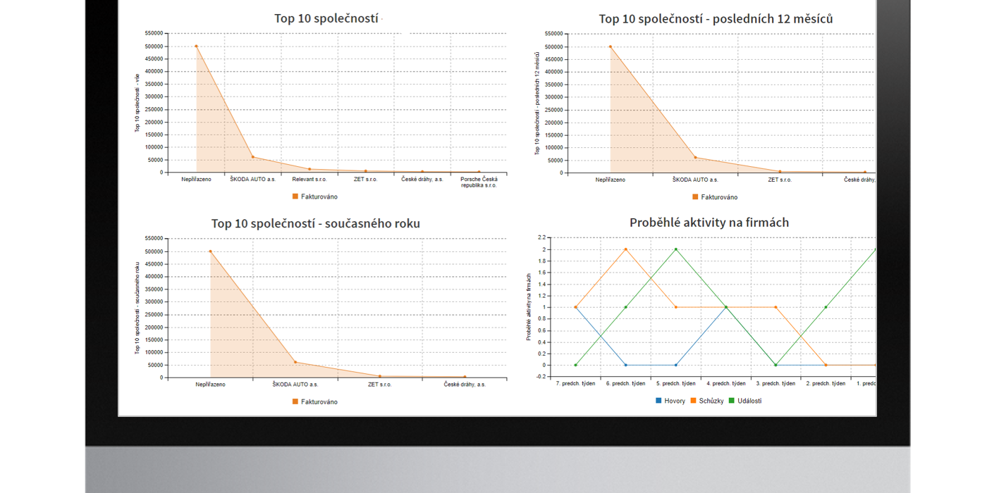 Kromě přehlednosti a rychlosti vám grafy Vistos CRM dají do ruky reprezentativní a profesionální podklady, které bude radost prezentovat před dalšími stranami. Ušetřete čas strávený nad vytvářením grafů v Excelu. Vistos CRM vše zařídí za vás.